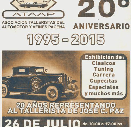 El próximo domingo 26 de julio se realizará un encuentro de automóviles de todo tipo en homenaje a los primeros 20 años de la creación de la Asociación Talleristas del Automotor y Afines Paceña (ATAAP). La muestra se realizará en el predio del Club de Leones de José C. Paz ubicado en Ruta 197 y Muñoz de la localidad de José C. Paz en la provincia de Buenos Aires desde las 10 horas hasta las 17 horas con entrada libre y gratuita.